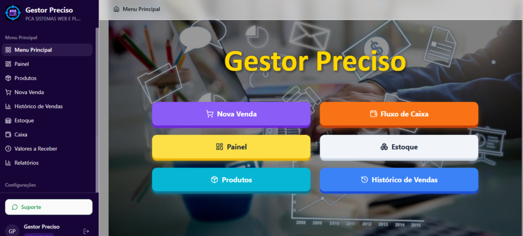 O Gestor Preciso: sistema de gestão para pequenos e médios empreendedores, oferecendo controle de vendas, estoque e finanças, de forma simples e prática.